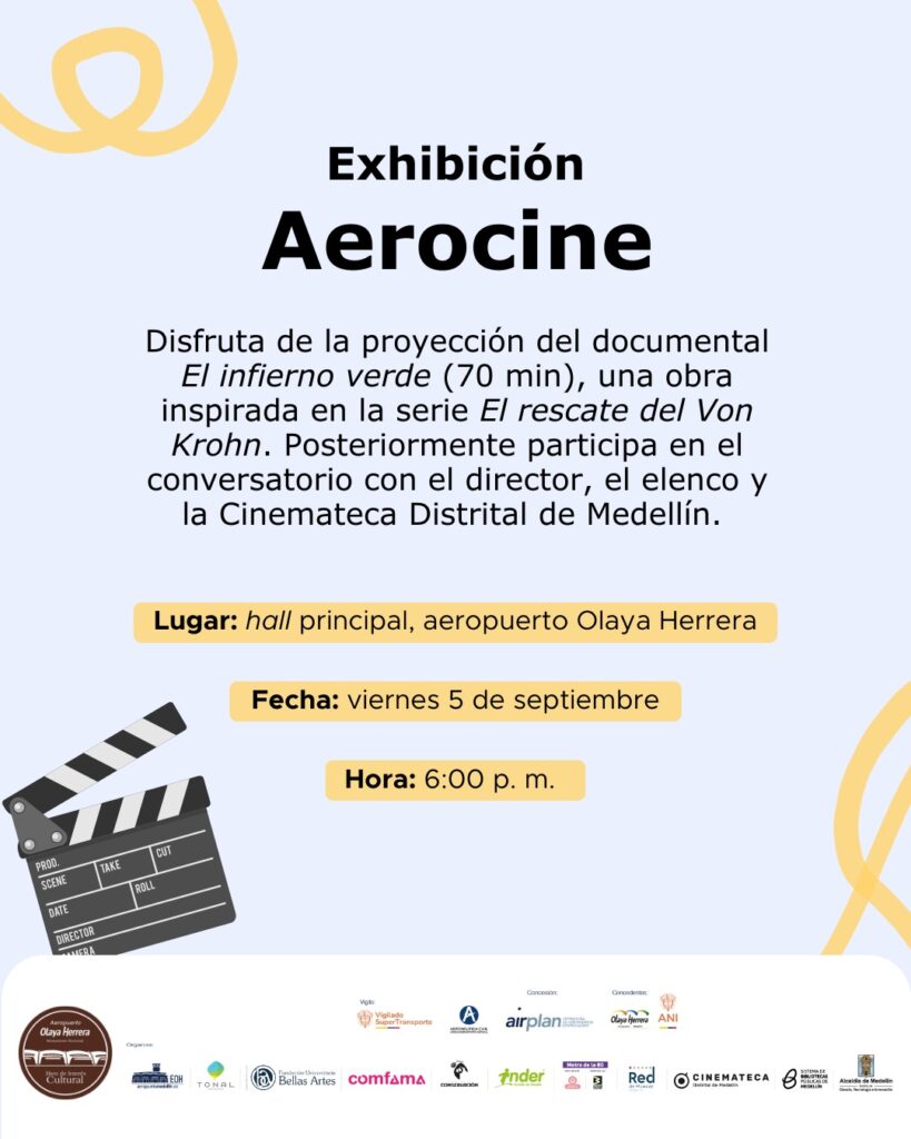 At the facilities of the emblematic Olaya Herrera airport in Medellín, declared an architectural heritage of the city, the screening of the documentary Green Hell was held as part of the cultural program “Plots of memory and heritage.” This was not just any screening: the film, which recounts the historic 1934 rescue of an aircraft crashed in the jungles of Chocó, found its ideal setting in this iconic aeronautical venue that has witnessed the evolution of Colombian aviation.