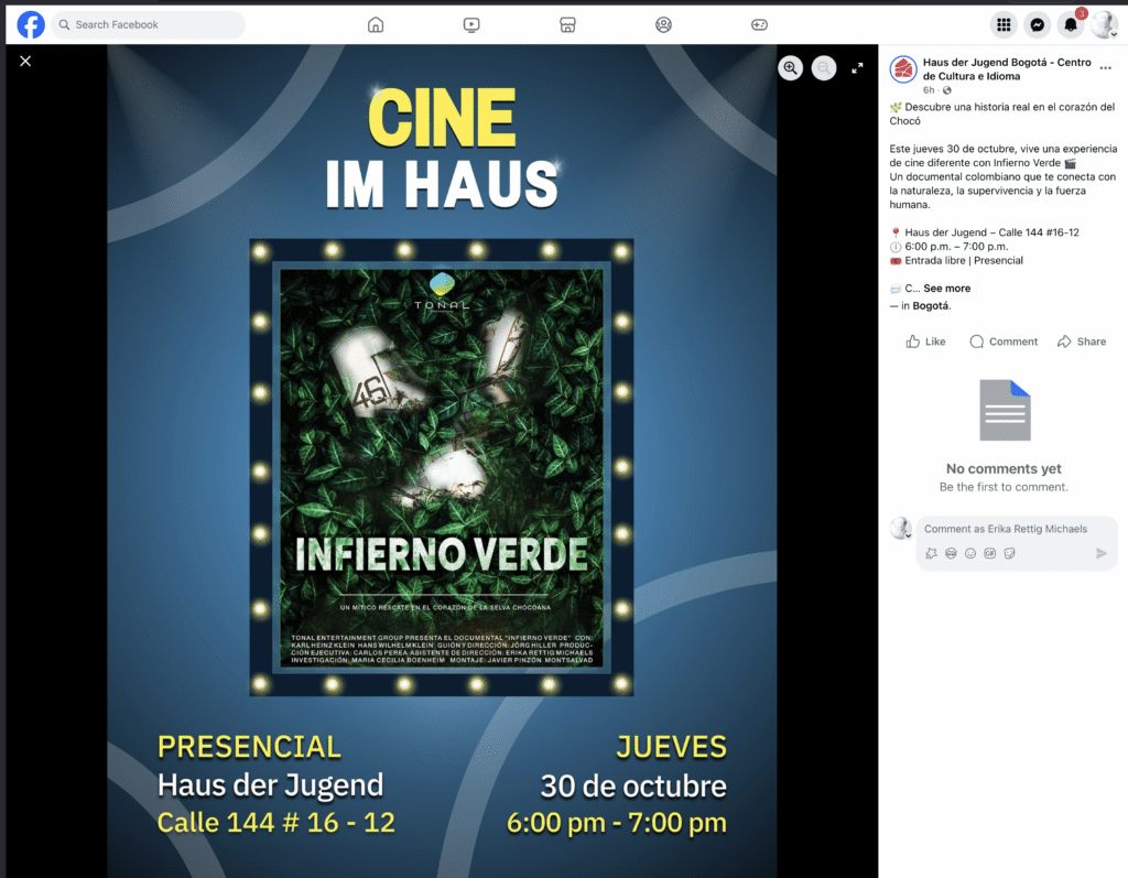 El Haus der Jugend – Centro de Cultura e Idioma Alemanas fue escenario de una emotiva proyección del documental histórico Infierno Verde, que rescata memorias poco conocidas del pasado colombiano. La obra narra el extraordinario rescate, ocurrido en 1934, del primer avión accidentado en las selvas del Chocó, una hazaña que marcó un hito en la aviación nacional y en la cooperación entre comunidades locales y actores internacionales.